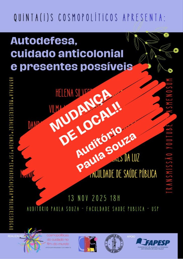 O projeto Cosmopolíticas do Cuidado no Fim-do-mundo realiza a última edição de 2025 dos Quintais Cosmopolíticos para debater práticas de cuidado anticoloniais. Com inspiração no conceito de autodefesa como forma de cuidado da filósofa e artista Denise Ferreira da Silva, esta edição convida mulheres à frente de movimentos sociais para uma conversa sobre como suas práticas de cuidado e enfrentamento fazem de presentes ameaçados possíveis. A décima edição dos Quintais Cosmopolíticos será realizada no dia 13 de novembro às 18h no anfiteatro Paula Souza da Faculdade de Saúde Pública (FSP) da USP.