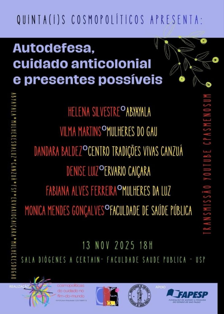 O projeto Cosmopolíticas do Cuidado no Fim-do-mundo realiza a última edição de 2025 dos Quintais Cosmopolíticos para debater práticas de cuidado anticoloniais. Com inspiração no conceito de autodefesa como forma de cuidado da filósofa e artista Denise Ferreira da Silva, esta edição convida mulheres à frente de movimentos sociais para uma conversa sobre como suas práticas de cuidado e enfrentamento fazem de presentes ameaçados possíveis. A décima edição dos Quintais Cosmopolíticos será realizada no dia 13 de novembro às 18h na sala Diógenes da Faculdade de Saúde Pública (FSP) da USP.